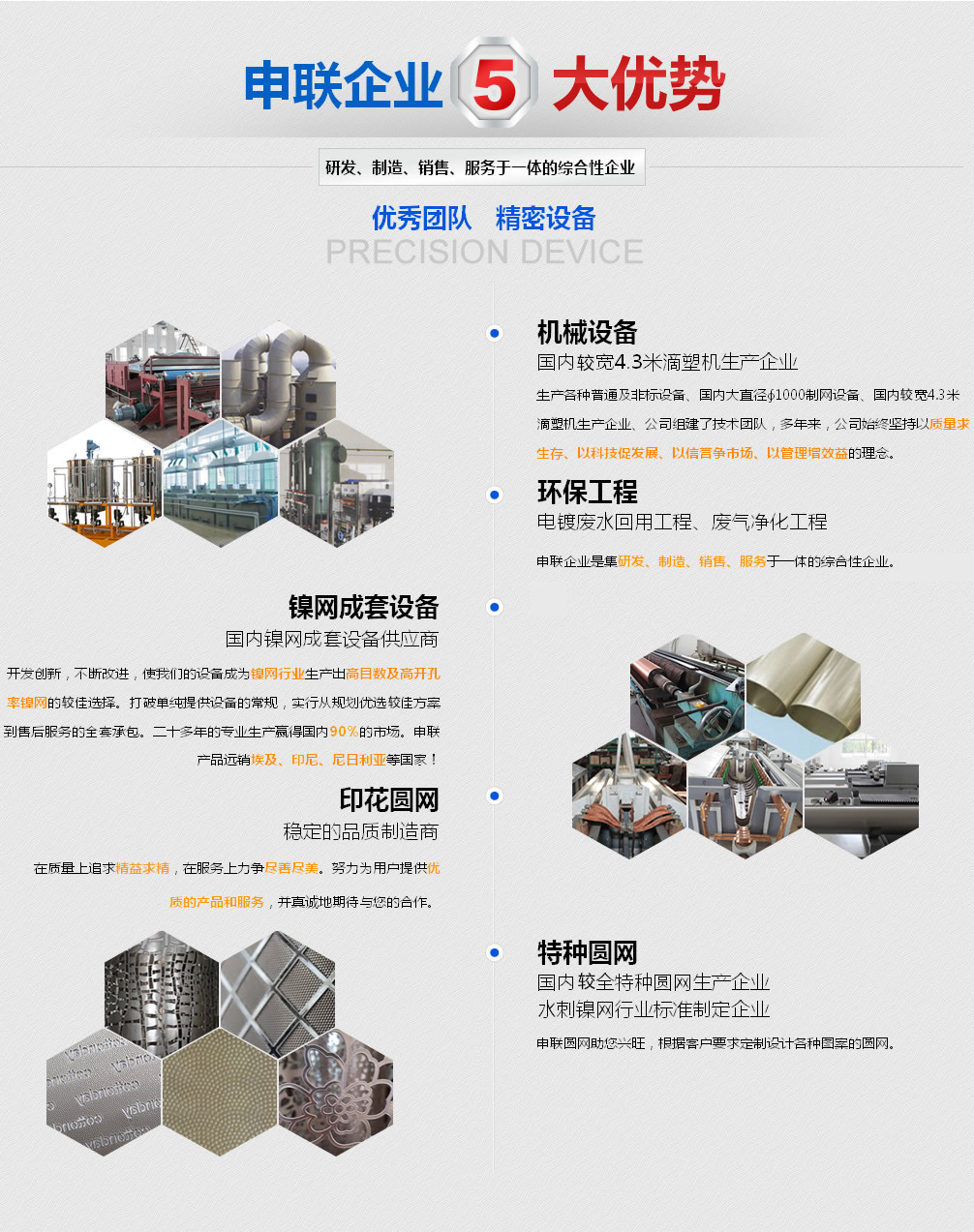 申聯(lián)企業(yè)是一家集機(jī)械設(shè)備、環(huán)保工程、鎳網(wǎng)生產(chǎn)成套設(shè)備、印染鎳網(wǎng)、特種鎳網(wǎng)等系列相關(guān)產(chǎn)品的研發(fā)、制造、銷售、售后服務(wù)于一體的綜合性企業(yè)。企業(yè)屬下有宜興申聯(lián)機(jī)械制造有限公司和宜興市申聯(lián)環(huán)保紡織器材廠有限公司。